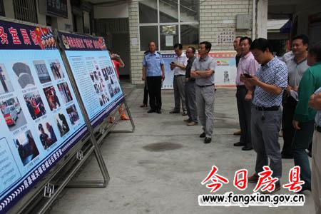 图为杜启学一行观摩大木厂镇五谷庙村社会综治工作展板