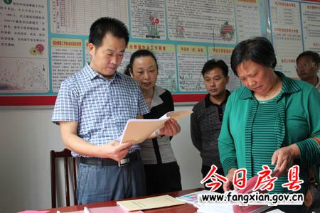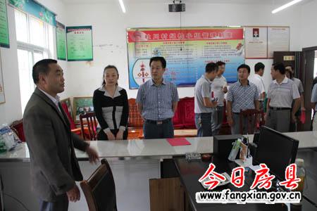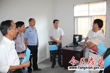 图为县委常委、政法委书记杜启察看野人谷镇杜川村社会综治工作档案