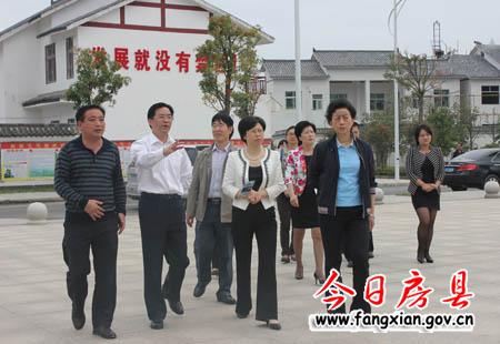 省委常委办公室主任陈艳霞(中)一行在县委副书记张慧彬(左二)的陪同下,视察军店镇双柏村移民小区建设情况。