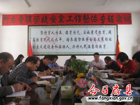 今日房县网讯 通讯员 任薇 张永国 王兴林 报道: 10日,门古寺镇召开学校安全工作整治专题会议。会上,镇党委书记、镇长王元涛同志要求,镇直各单位、各学校要进一步提高认识,增强意识,密切配合,联合行动,立即行动起来,提高学校安全工作水平,特别是学生上下学的交通安全和学生在校的饮食安全,确保校园平安。并决定近期,由镇综治办、派出所、卫生院、中心学校组成督查小组,对本镇范围内的11所学校进行学校安全工作督查和暗访,对发现的问题决不姑息,及时予以通报的同时,将直接追究相关人员的责任。