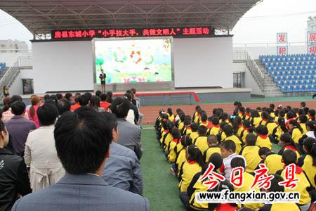 今日房县网讯 通讯员 李英 报道:为深入贯彻落实县委、县政府“优化发展环境”和“创建文明城”活动,在学生和家长中倡导文明新风,培养他们争当文明人,争做文明事,争创文明城区的文明意识和文明习惯,通过学生把教育活动延伸到家庭和社会,全力以赴整治城市环境,提高市民素质,树立房县良好形象。10月12日上午,东城小学组织全体师生和部分家长共同举行了 “小手拉大手,共做文明人”主题教育活动启动仪式。