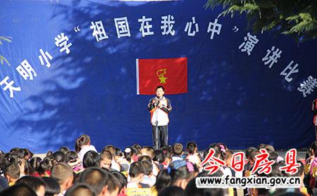 23日,房县天明小学举办以“祖国在我心中”为主题的演讲比赛,全校13名学生参赛,1000余名师生观摩赛事。在建国64周年之际,此演讲赛的举办一方面促进学生的爱国主义教育和民族传统教育,另一方面也在实践活动中培养和提高学生的综合素质。