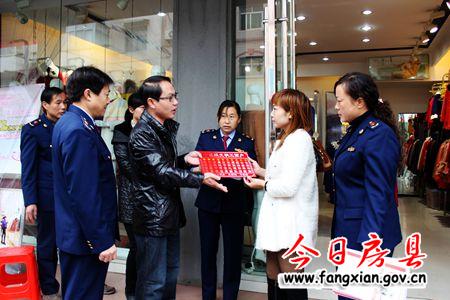 县“四城联创”指挥部和工商部门人员为“十星级工商户”送发红标牌
