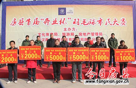 据悉,女单前三名分别由青峰小学教师李江南、实验中学教师吴华、国税局干部孙开萍获得,男单前三名分别为房县一中教师杨林成、国土局干部尹一升和房县铁通公司职员董德昌。闭幕式上,单打前三名分别获奖金5000元、2000元和1000元,第四到八名各获奖200元羽毛球拍一副,第九到三十名均得到价值50元的奖品一份。