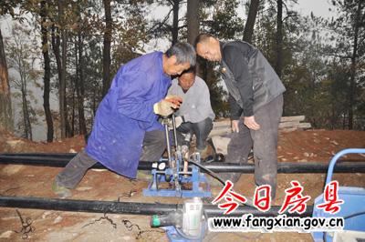 今年来,青峰镇陡口村抢抓整村推进扶贫开发机遇,把解决群众最需要解决的饮水问题作为重要内容,多方面争取县扶贫办等部门支持,组织群众广泛参与,历时半年完成拦河坝、过滤池、蓄水池建设,铺设主管道10000米。图为工人正在对管线进行连接操作。(昝小兵 张仁华 摄)