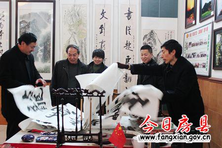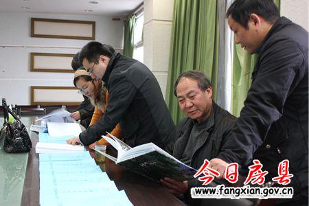 徐道辉(右二)一行在县“四城联创”指挥部查看我县精神文明创建资料