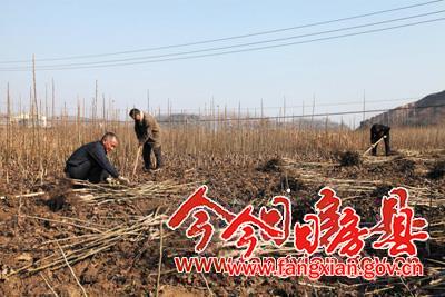 核桃产业是全市“四个百万工程”之一,我县依托自然资源禀赋,选育自主知识品牌的“房陵一号”和引进“清香”品种繁育苗木2000亩 ,今冬明春可出圃核桃苗木120万株,满足全县发展核桃产业种苗需求。截至目前,全县已发展核桃基地45.8万亩。图为付家湾中心苗圃职工在高桥村核桃育苗基地起苗。 (陈立煌 摄)