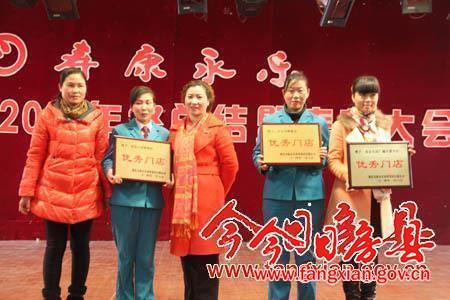 寿康永乐房县区域总经理朱玉梅(中)为优秀门店颁奖