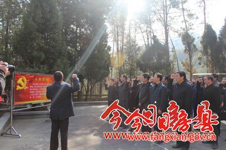 在凤凰山烈士陵园,沈明云一行代表县委县政府向革命烈士纪念碑敬献了花圈。在县委常委、组织部部长陈渊带领下,全体党员干部面对革命烈士纪念碑和鲜艳的党旗,庄严举起右手,重温入党誓词,并聆听了原县委办副主任孙希清讲述的房县革命史。