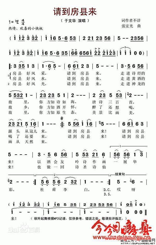 《请到房县来》是专门配合2010年房县诗经文化节创作的主题曲,由著名歌手于文华演唱。自2004年、2005年以来,房县的“诗经民歌”令外界大为惊叹的同时,也得到了当地政府的重视。2007年,房县出台《房县民间艺人资格评审暂行办法》,对在当地有一定影响力的民间艺人建档立案;该县还创建了53个民间文化保护示范村,建起25个民歌堂……2010年8月,首届中国(房县)诗经文化节开幕,万人齐诵“关关雎鸠”,预示着诗祖故里将重放光芒!