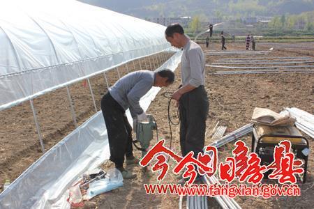 图为工人们正在加紧建设育秧大棚