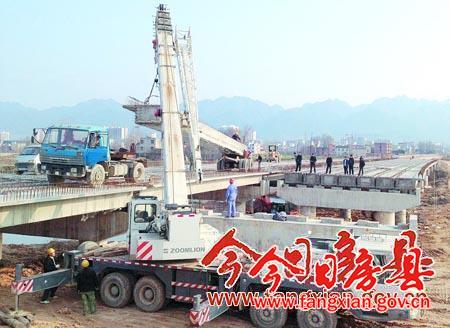 转十堰日报 报道:4月13日,在谷竹高速公路房县互通连接线盘峪河大桥施工现场,工人正在架设梁板。今年以来,房县狠抓项目建设,在推进谷竹、十房两条高速公路建设的同时,加快高速公路互通连接线工程建设,着力构筑快速、便利的交通网络。 记者杜达巍摄