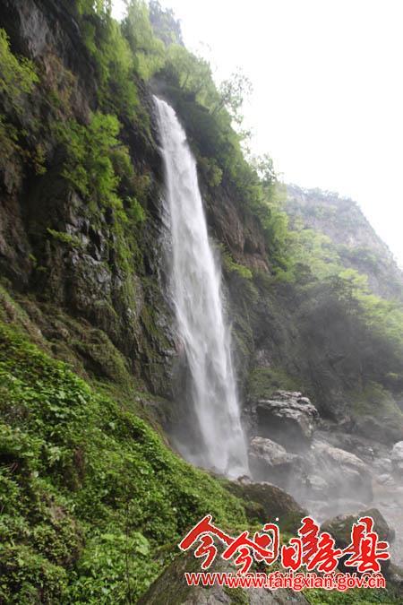 顺着溪流步行约半个多小时后,伴随着虎啸龙吟般的轰鸣声,记者远远看到,一条白布似的激流从陡峭的山崖上飞流直下,给人一种大气磅礴的感觉。惊人的水势带起了强劲的山风,整个山谷中溅起了一片水雾。瀑布下方的怪石被激流冲涮得异常光滑。目测瀑布落差约60米,宽度约5米,比野人谷龙须沟瀑布和青峰镇龙王沟瀑布更为壮观。