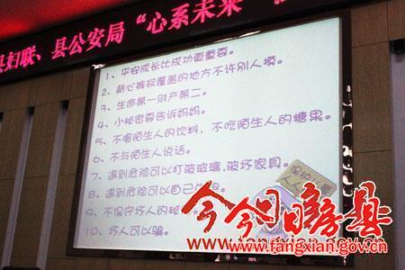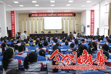 今日房县网讯 记者 高书文通讯员 李英 报道: “平安成长比成功更重要”、“背心裤衩覆盖的地方不许别人摸”、“遇到危险可以自己先跑”……30日,在县东城小学阶梯教室举办的儿童安全知识讲座中,全体学生大声整齐地复述着县公安局宣讲员的“儿童安全十大宣言”。