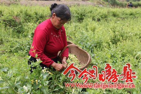 日前,沙河乡邢家湾村村民张明彦正在采摘金银花。沙河乡森林覆盖率高,今年雨水好,金银花生长茂盛。村民们种植的500余亩金银花进入采收旺季,村民每天采摘鲜金银花达10公斤左右,每公斤鲜金银花可晾晒0.2公斤干金银花,按目前市场上干金银花收购价每公斤80元计算,每天收入可达160元左右,一个采收季节下来,人均收入达到4000至6000元。 (田华锐 刘文婕 摄)