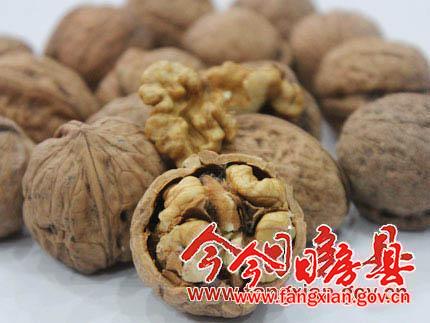 核桃,核果球形,外果皮平滑,内果皮坚硬,有皱纹,呈大脑形,属种子植物门,木材坚韧,果仁可吃,可榨油,可入药。原产于中亚地区,又称胡桃、羌桃,与扁桃、腰果、榛子并称为世界著名的“四大干果”。既可以生食、炒食,也可以榨油、配制糕点、糖果等,不仅味美,而且营养价值很高,被誉为“万岁子”、“长寿果”。 房县核桃以其个大、壳薄、味香而成为核桃中的精品,近50万亩的核桃基地和每年2—3万亩的递增速度正在将房县造就成全国核桃第一大县。