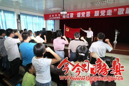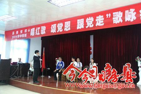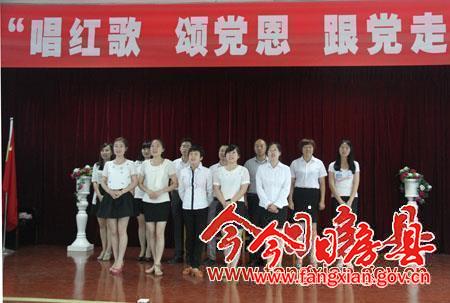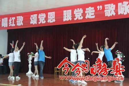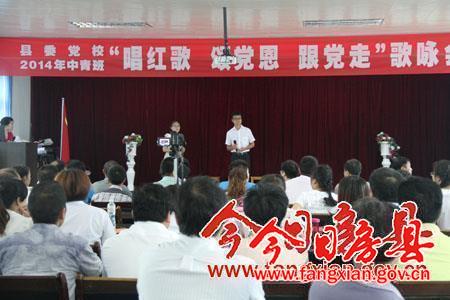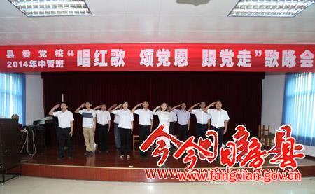 26日,县委党校2014年中青班开展了以“唱红歌 颂党恩 跟党走”为主题的歌咏会,庆祝建党93周年。中青年干部们通过重温入党誓词、红歌联唱、舞蹈等形式,歌颂祖国,歌颂党,展现昂扬向上的精神面貌。(赵爱平 高书文 摄)