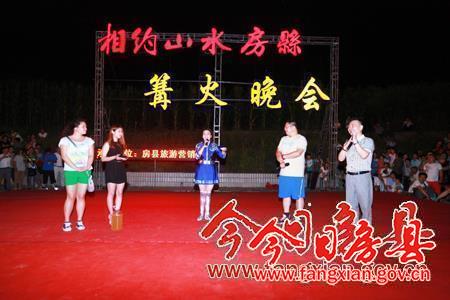 晚会在县文化局艺术团表演的节目《舞动中国,舞动双野》、《请到房县来》中拉开序幕。同时,吴永强、高明哲、张富华及有关单位负责人在现场点燃了篝火。在热烈的气氛中,大家通过舞蹈、民歌、游戏、有奖问答以及进入复赛的30名旅游形象大使登台亮相等形式,为西安、襄阳、十堰三地的游客送上了一餐富有房县特色的文化盛宴。