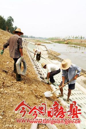 19日,城区中小河流城关镇三海段堤防工程进入护坡阶段。该河堤工程长55公里,兴建于上世纪七十年代初,由于年久失修,堤防工程千疮百孔。2002年至今,县委、县政府实施分年、分期除险加固堤防工程。目前,完成投资4.8亿元,加固除险河堤37.6公里。(张启龙 施佳 摄)