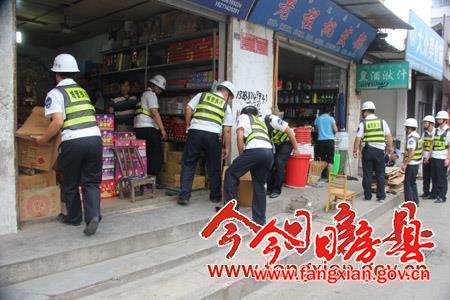 今日房县网讯 记者王玮 报道:26日,记者在城关镇东城门路段看到,县城管局12名执法人员正在对县一中周边街道存在的超门面经营、游散摊点经营以及车辆乱停乱放现象进行整治,帮助商户将占道经营物资搬入门店内,并对几个流动摊点的摊主进行劝离教育。