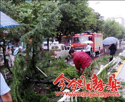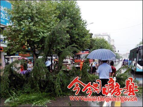 28日上午7时许,房陵大道九八家电超市门前,一棵20余米长的景观树,因暴雨袭击,突然倒于路中,防护栏被打断,致使交通受阻,成群结队车辆不能通行。