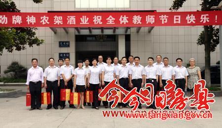10日上午,劲牌神农架酒业有限公司秉承回馈社会的企业理念,在欢庆教师节之际,公司销售部经理冯亚文与房县销售部员工前往房县一中向教师们表达节日问候,并向该校37名优秀教师赠送价值八千元的劲牌神农架生态酒。 (赵爱平 高英摄)