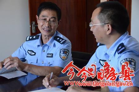 孙成柱(左)与年青民警交流工作经验