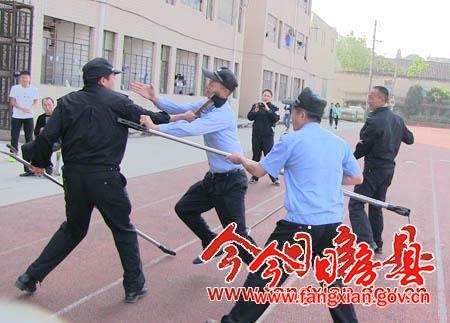 近日,为了全面普及安全教育,加强校园安全防卫,提高各校安保人员的防范能力,军店镇派出所组织6名警察,给县二中、军店镇中、军店小学等学校的安保人员上了生动而精彩的一课。警官通过模拟和演示,教会学校安保人员如何区分正常人和歹徒;如何自卫、劝解和逼退歹徒进校;如何使用刀、叉、逮捕器等防卫工具制服歹徒。(钟正菊 摄)
