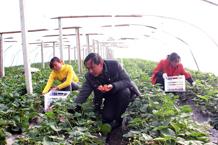 新年伊始,白鹤镇赤岩村绿丰园果蔬基地里工人们忙着采摘草莓(如图)。“反季节草莓可以买到每斤15元的批发价,每亩可收获5000斤,亩产值达4万多元”。绿丰园果蔬基地负责人王展波向记者介绍说。近年来我县大力发展蔬菜产业,2014年全县播种蔬菜达14.52万亩,实现产量18.55万吨,产值5.5亿元,全县菜地保有量达8.5万亩。 (陈锐 王明安 摄)