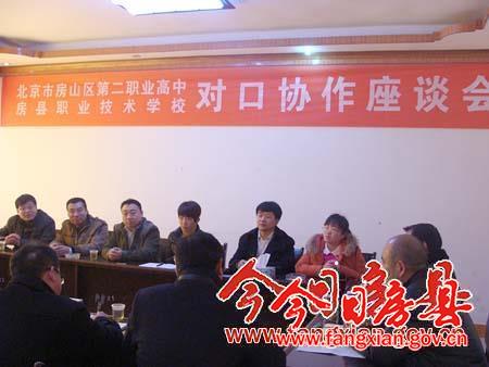 座谈会上,冯耀武简要介绍了房县职业技术学校发展历史、校园概况、师资力量、学科发展、专业设置等情况,特别介绍了学校目前发展中存在的困难,希望能与北京市房山区第二职业高中建立友好的协作工作关系,在师资队伍建设、教学管理、专业建设等几方面得到大力帮助和支持。随后双方的专业主任分别就专业管理、专业发展等实际问题进行了交流、探讨,双方均表示要进一步细化对口协作事宜。会议就师资培养、专业建设、干部培训等问题进行了初步的磋商,并达成了意向性协议,即县职校每年派出三至五名教师到房山区二职高学习,同时推选20名学生到二职高汽车专业学习。