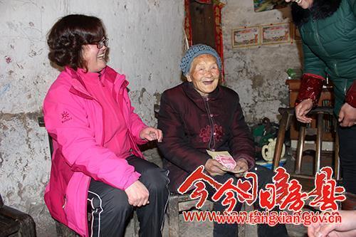 县委常委、宣传部部长徐锦凤(左二)将棉被送到困难老人手中
