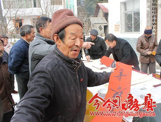 在五台乡红场村,书法家们不顾天气寒冷,挥毫泼墨,现场免费为村民书写春联和福字,当天前来领取春联的村民络绎不绝,村民们依据书法家提供的春联手册,选择各自喜好的春联内容,这些春联既有挥别马年、喜迎羊年辞旧迎新的美好愿景,也有歌颂党恩、宏图大展的励志高歌,还有论婚庆、建新房、经济繁荣、百业火红的幸福美景。