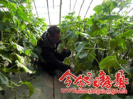 房县城关镇在推进城镇化、工业现代化的同时,始终坚持严格的耕地保护政策,大力发展设施蔬菜,既让农民增收,又为节日市场提供新鲜放心菜品。图为2月11日该镇下西关社区居民颜德声正在蔬菜大棚查看黄瓜长势情况。(潘必国 柯抗 摄) 房县城关镇在推进城镇化、工业现代化的同时,始终坚持严格的耕地保护政策,大力发展设施蔬菜,既让农民增收,又为节日市场提供新鲜放心菜品。图为2月11日该镇下西关社区居民颜德声正在蔬菜大棚查看黄瓜长势情况。(潘必国 柯抗 摄)