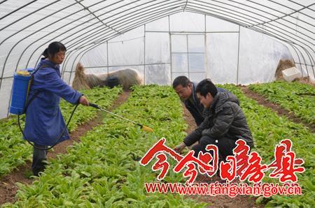房县国土局结合产业发展规划,在中部平坝区大力实施土地整治项目,改善农业发展环境,推动土地流转,实现了传统农业向现代农业的转变,进一步丰富市民“菜篮子”。图为蔬菜产业工人正在蔬菜大棚内加强日常管理。(柯启文 袁升 摄)
