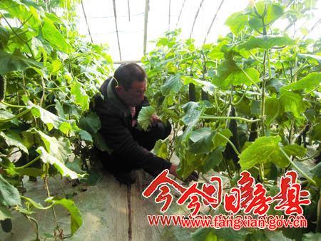 今日房县网讯 通讯员 潘必国 柯抗 报道:房县城关镇在推进城镇化、工业现代化的同时始终坚持严格的耕地保护政策,大力发展设施蔬菜,既让农民增收,又为节日市场提供新鲜放心菜品。图为2月11日该镇下西关社区居民颜德声正在蔬菜大棚查看黄瓜长势情况。