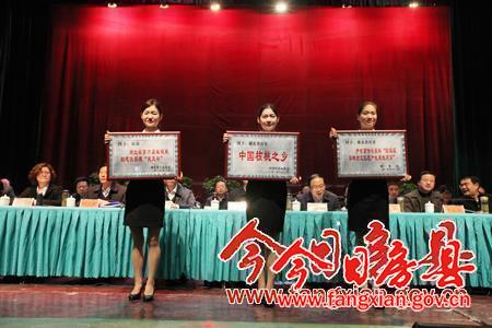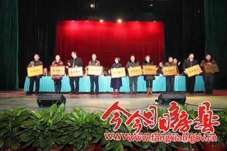 会上,县委常委、常务副县长王家波宣读2014年度财源建设分成奖励文件,县委常委、县委办公室主任张永平宣读2014年度全县经济社会发展先进单位和先进个人表彰文件。会议还对军店镇等4个红旗乡镇,县水务局等6个红旗单位,土城镇等65个先进单位,姚志新同志等197名先进工作者,化龙堰镇高桥村等20个红旗村,付超同志等10名“十佳”爱岗敬业标兵,赵连祥同志等10名“十佳”优秀村(社区)党支部书记,化龙堰镇等10个财源建设先进单位,大木厂镇等10个招商引资工作先进单位和邓明同志等15名招商引资工作先进个人,县发改局等10个项目争取工作先进单位和张安学同志等10名项目争取工作先进个人,县政务服务中心等10个服务项目建设先进单位和莫仕喜同志等15名服务项目建设先进个人予以通报表彰。城关镇、交通局、县农商行等单位,李如清、付超等个人做典型交流发言。