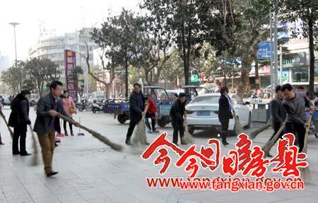 图为县水务局干部正在清扫街道。(张启龙 摄)