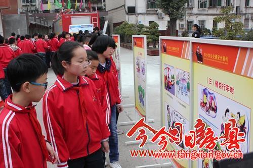 学生们观看交通安全知识展板