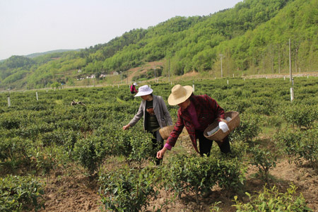 16日,窑淮镇茶农在三岔片区万亩标准化茶叶基地采摘新茶。据神农贡茶叶公司负责人介绍,今春雨水充沛,利好茶叶生长,产量有望翻翻。据了解,今年,窑淮镇加快调整产业结构,将从一二产业向第三产业延伸,大力发展农家乐、生态观光农业、旅游业,多渠道实现富民强村目标。(昝俊 张伟 摄)