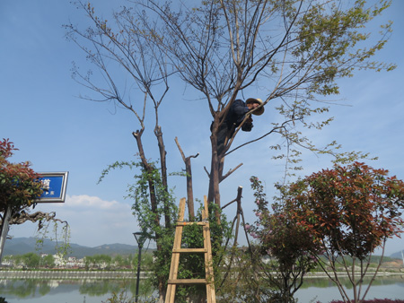 今日房县网讯 通讯员 吴量 报道: 日前,笔者在绿满河堤的滨河大道看到,数个园林绿化技术人员正攀爬在高大的紫薇树上,熟练的用嫁接刀割开一个个树干,把削好的接芽迅速插入砧木接口内,再用塑带将切口从下往上紧紧缠绕包裹,完成了一株株紫薇嫁接工作。