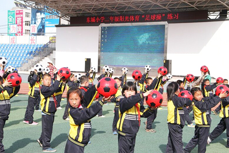 据了解,自该校申请“市级足球示范校”以来,东城小学便认真组织学习习近平总书记“足球要从娃娃抓起”的重要讲话,深刻领会理解“中国梦”、“足球梦”的意义,认识到“足球对于健全体魄、人格培养、能力发展、心智开发、健康成长”等的重要作用,体育组老师便着手自编足球操,并在大课间进行广泛推广,推进了校园足球操的普及,促进了该校学生的德智体全面发展。