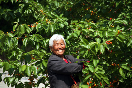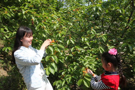 自1985年以来,房县城关镇积极引导农民发展庭院经济,地处城郊的八里村充分发挥区位优势,大力发展旅游观光农业,建起了樱桃专业村。全村510多户人家,户平种植樱桃60余株。每年樱桃成熟时,吸引了大批客商和游客前来购买、观光。仅此一项,全村农民年均增收14万多元。图为27日游客在该村一组采摘樱桃。 (赵爱平 张立华摄)