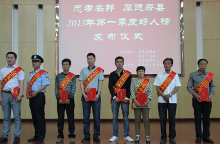 6日,我县举办2015年度房县好人榜一季度榜单发布仪式,对孝老爱亲好人郭宝菊、李远贵、宁永翠、张吉典,助人为乐好人赵伟、王斌,爱岗敬业的王平、雷禹、殷自旭,共9位房县好人进行表彰。