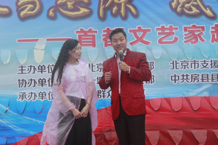 下午五点三十分,天空开始飘洒小雨,在观众的隆隆掌声中,演出由县文体局舞蹈《关雎》拉开序幕。为表达对库区人民的感恩之情,“公益歌王”金山连续演唱了两首歌曲:特别为“南水北调”工程库区建设者和移民群众创作的《房前屋后》讴歌了库区移民的无私奉献和牺牲精神,《我的父亲母亲》为房县人民送上母亲节诚挚的祝福。他富有磁性的歌声让观众听得如痴如醉。著名相声演员祥子和梁子的相声《学啥像啥》表演表情丰富、内容逗趣、演技精湛,让观众们笑声不断,将整个演出推向高潮。 喜气洋溢的《狮子舞》、生动逼真的《口技》表演、男女声对唱《北京叫卖声》、河南坠子《苏东坡与苏小妹》等节目,也个个精妙绝伦、饱含深情,表达出北京人对库区移民深深的谢意和感恩之心。