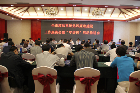 会上,周爱军对全省政法系统党风廉政建设工作座谈会暨“守讲树”活动推进会会议精神进行了传达;丹江口市委政法委、竹溪县委政法委、市公安局纪委、市检察院纪检组,交流了落实党风廉政建设“两个责任”经验;房县县委政法委、市司法局、茅箭区委政法委、郧西县委政法委,交流了“守纪律、讲规矩、树形象”活动经验;市“守讲树”活动四个巡查组通报了第二阶段巡查工作情况。