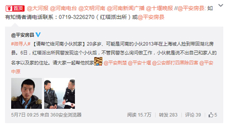 从@平安房县微博截图可以看到,截至5月13日下午,该寻人信息阅读量达15.7万人次,转发283次,其中河南大部分媒体均有转发。但截至目前,房县公安部门没有收到任何相关有价值信息。