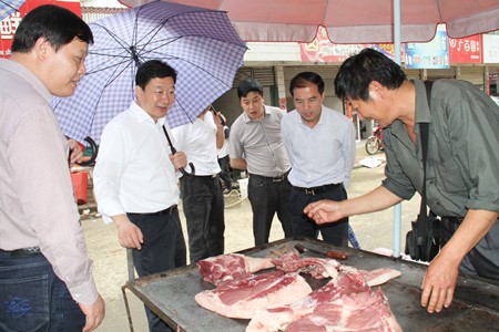 “黄瓜都是自家地里种的?你摊位上猪肉的检疫印章在哪......”周霁首先来到青峰镇农贸市场,与卖菜农民亲切交谈,询问蔬菜、副食品价格和销售情况。周霁指出,小菜摊事关大民生,要加强农贸市场的安全管理,确保方便群众卖菜、买菜,吃的都是“放心菜”。