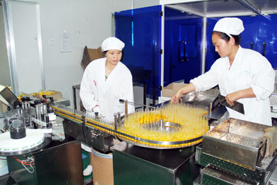 武当动物药业的注射剂车间贴标岗位工人正在给产品贴标