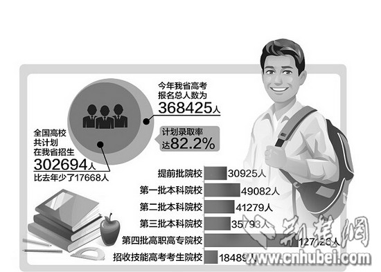 楚天金报讯(记者宋锐 实习生徐婉露)昨日,湖北省招办在官网上发布了2015年普通高等学校招生计划。今年,全国高校共计划在我省招生302694人,比去年少了17668人。今年我省报名总人数为368425人,因此,虽然招生人数在减少,但计划录取率达82.2%,超过去年近3个百分点。这意味着,再加上录取过程中追加的计划,我省高考录取率今年必将创下新高。
