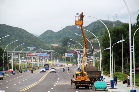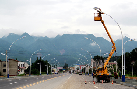 近日,记者在南宁路(高速公路连接线)看到,县城管执法局路灯所工作人员正在安装路灯。据悉,该路段一期工程共860米,投资50万元新装的48套LED路灯已基本安装完毕,待后续工程完工后即可通电投入使用。 (赵爱平 张 力摄)